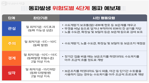 -5℃ 미만의 날씨가 지속되면 동파 확률이 높아지고 , -15℃미만 2일 이상 지속되면 동파 확률이 높아지면서