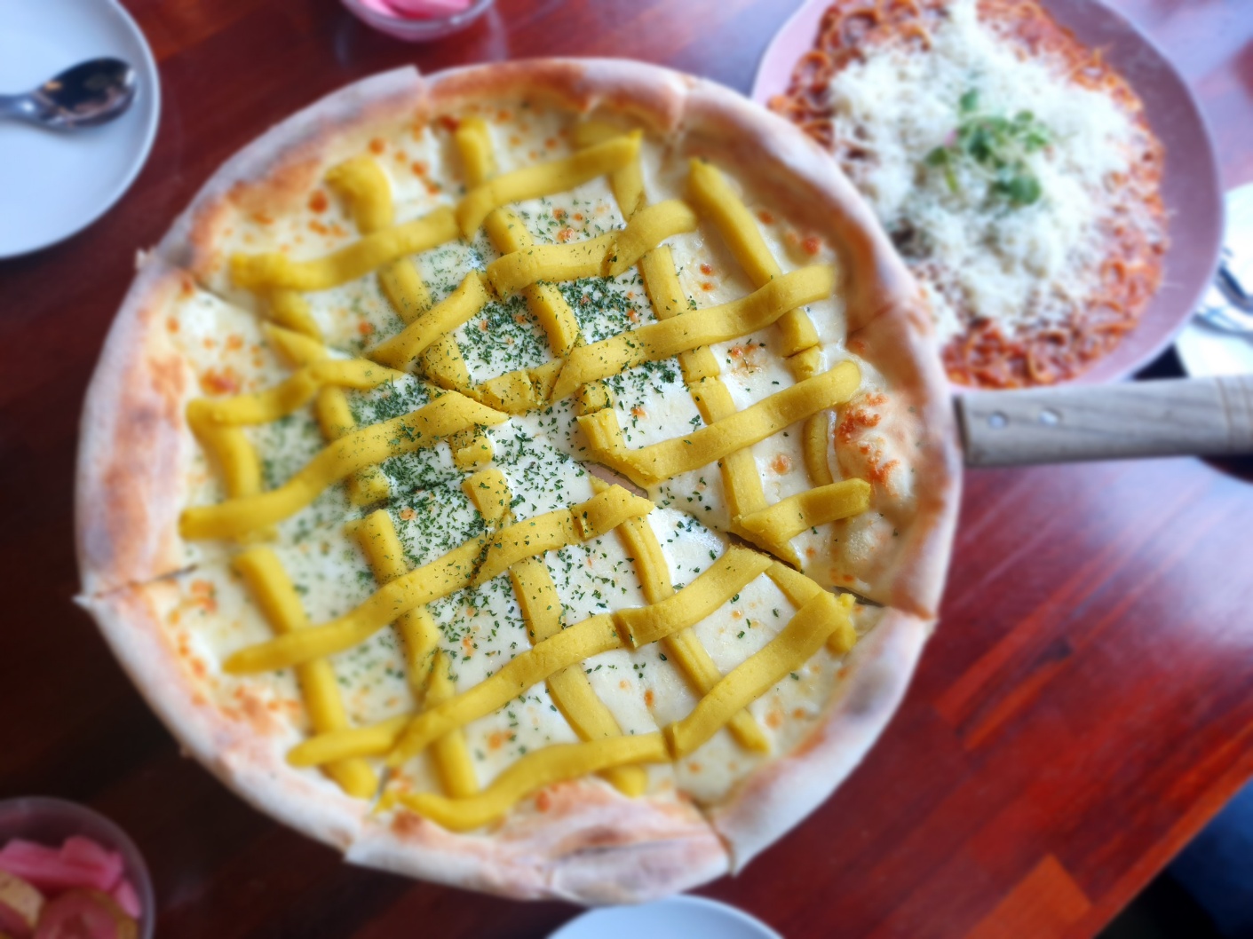 고구마 피자를 개인적으로 좋아하지 않아 한 입만 맛보려 했는데, 한 조각을 다 먹고 말았습니다.