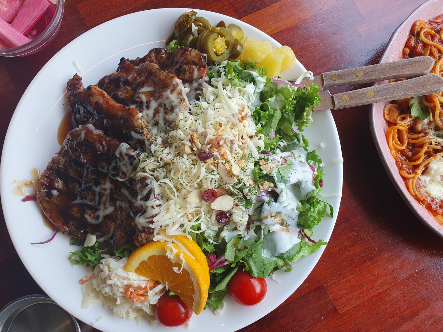목살스테이크 비주얼이 장난이 아닙니다. 고기반, 샐러드반 고기보다 샐러드를 좋아하는 저는 아주 만족했고 , 고기도 적절한 불향과 달콤한 소스 아이들이 좋아하겠다 싶었는데, 어머니가 더 좋아하셨어요. 샐러드는 싱싱하고 갈릭소스가 야채와 너무 잘 어울려서 진짜 맛있게 먹었습니다.