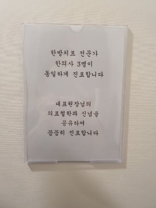한의사 3명이 계시고, 저는 대표 원장님께 진료를 봤습니다. 꼼꼼하게 잘 봐주시고 설명도 자세히 잘해주셨습니다. 간호산 선생님들도 친절하세요. 나이 지긋이 드신 할머니께서 오셔서 환자복은 빨았냐? 나 깔끔한 사람이다 등 이것저것 쉴 틈 없이 물어보시는데.. 끝까지 친절하게 다 응대를 하는 모습에.. 친절함 인정합니다.