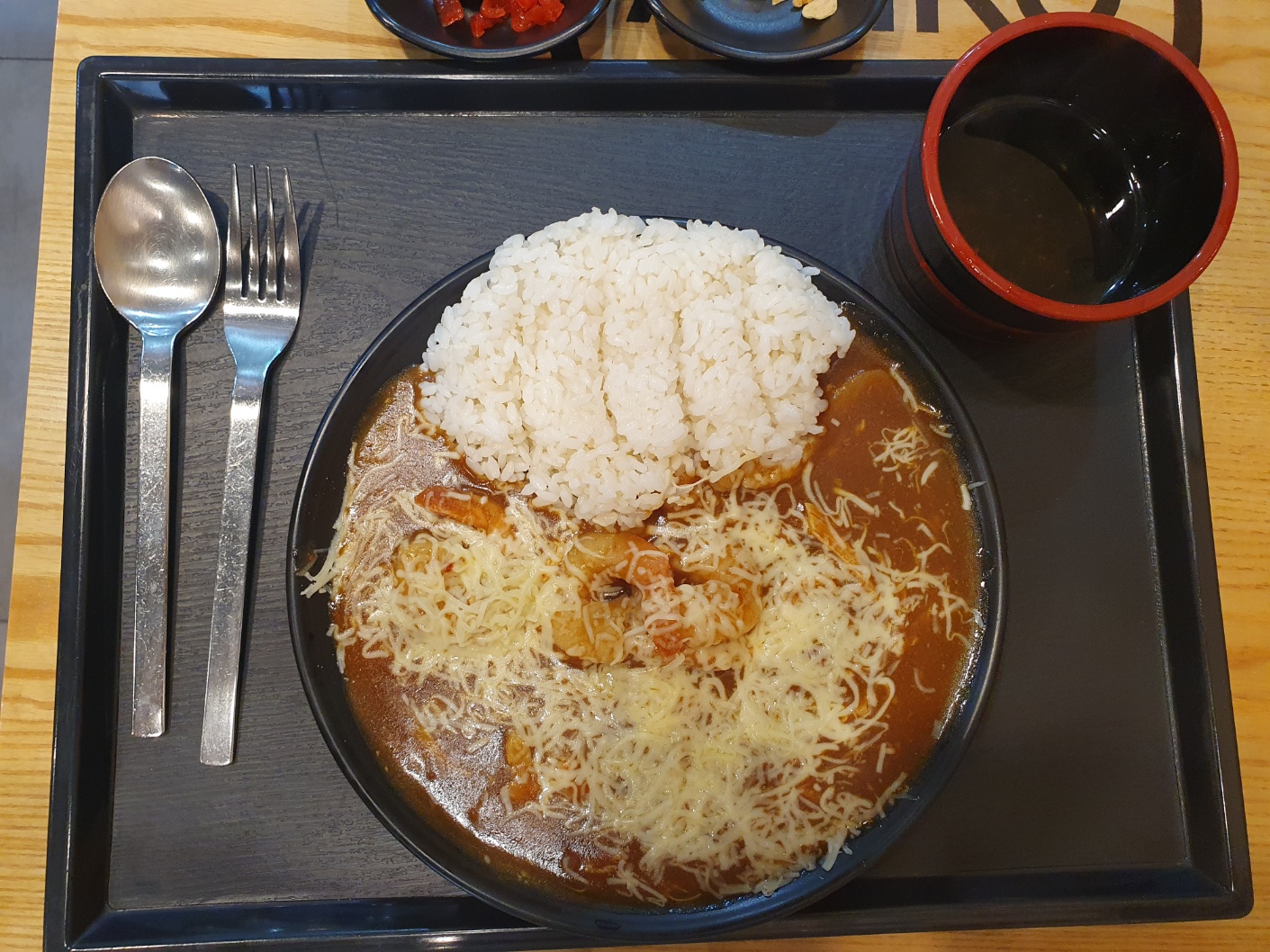 저는 쉬림프카레에 눈꽃치즈를 추가했는데... 정말 탁월한 선택이었습니다. 매콤한 카레에 살이 통통한 새우 쭉쭉 늘어나는 치즈까지 잘 선택하였습니다. 저희는 둘 다 매운걸 잘 먹지도 그렇다 가고 아예 못 먹지도 않아