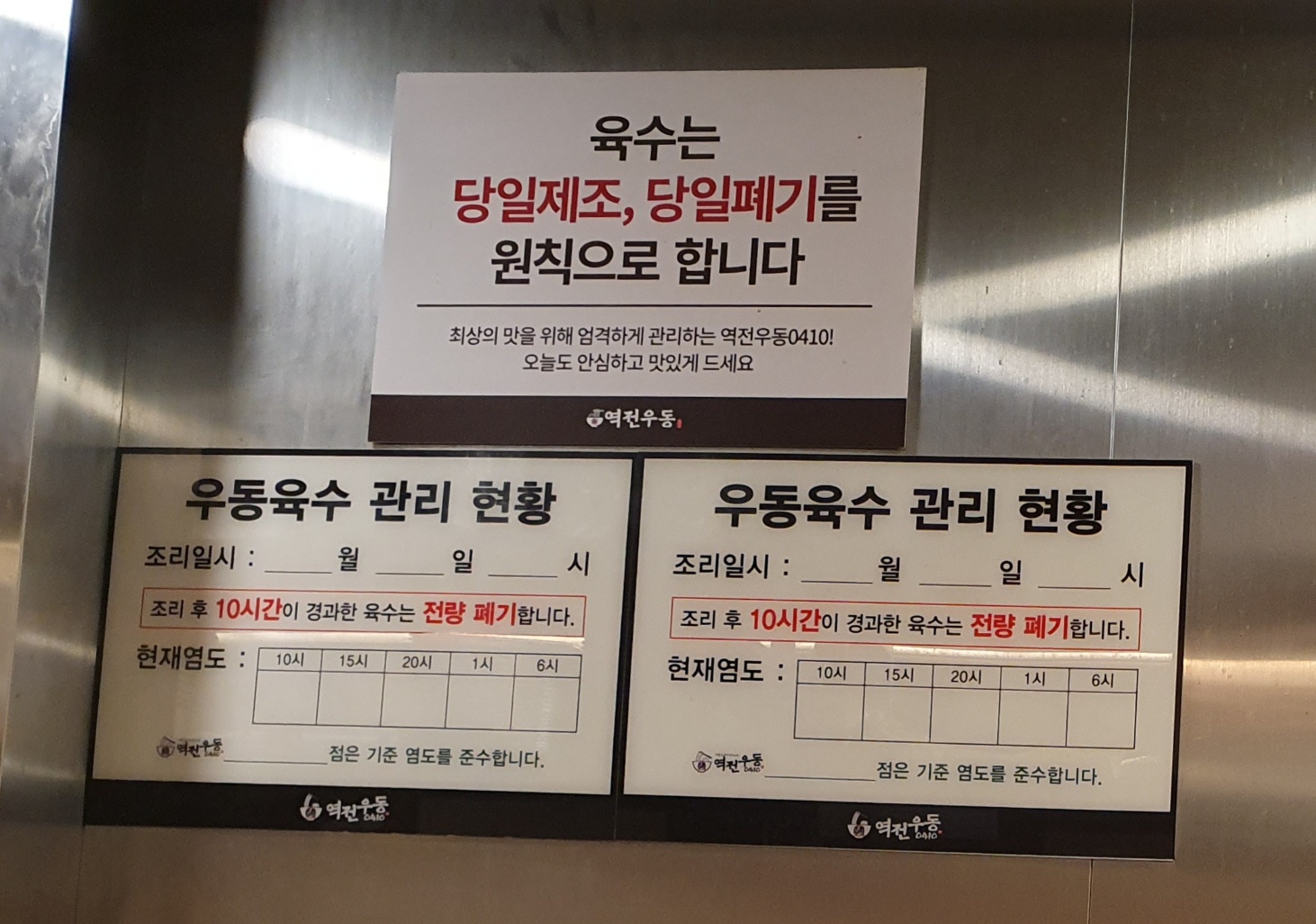 주문 후 자리에 앉으니 앞에 육수는 당일제조, 당일폐기를 원칙으로 합니다라는 글이 쓰여 있는데, 당연한 말인 거 같은데 왠지 신뢰가 가네요...
