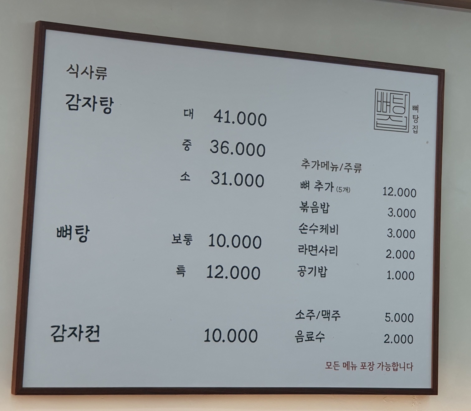 메뉴로는 감자탕, 뼈탕, 감자전이 있습니다. 오픈한 지 얼마 되지 않아서인지 식당 안은 매우 청결하고 그사이 맛집으로 소문이 나서 조금 대기하고 먹을 수 있었습니다. 저희는 둘이 가서 뼈탕 보통을 주문하였습니다.