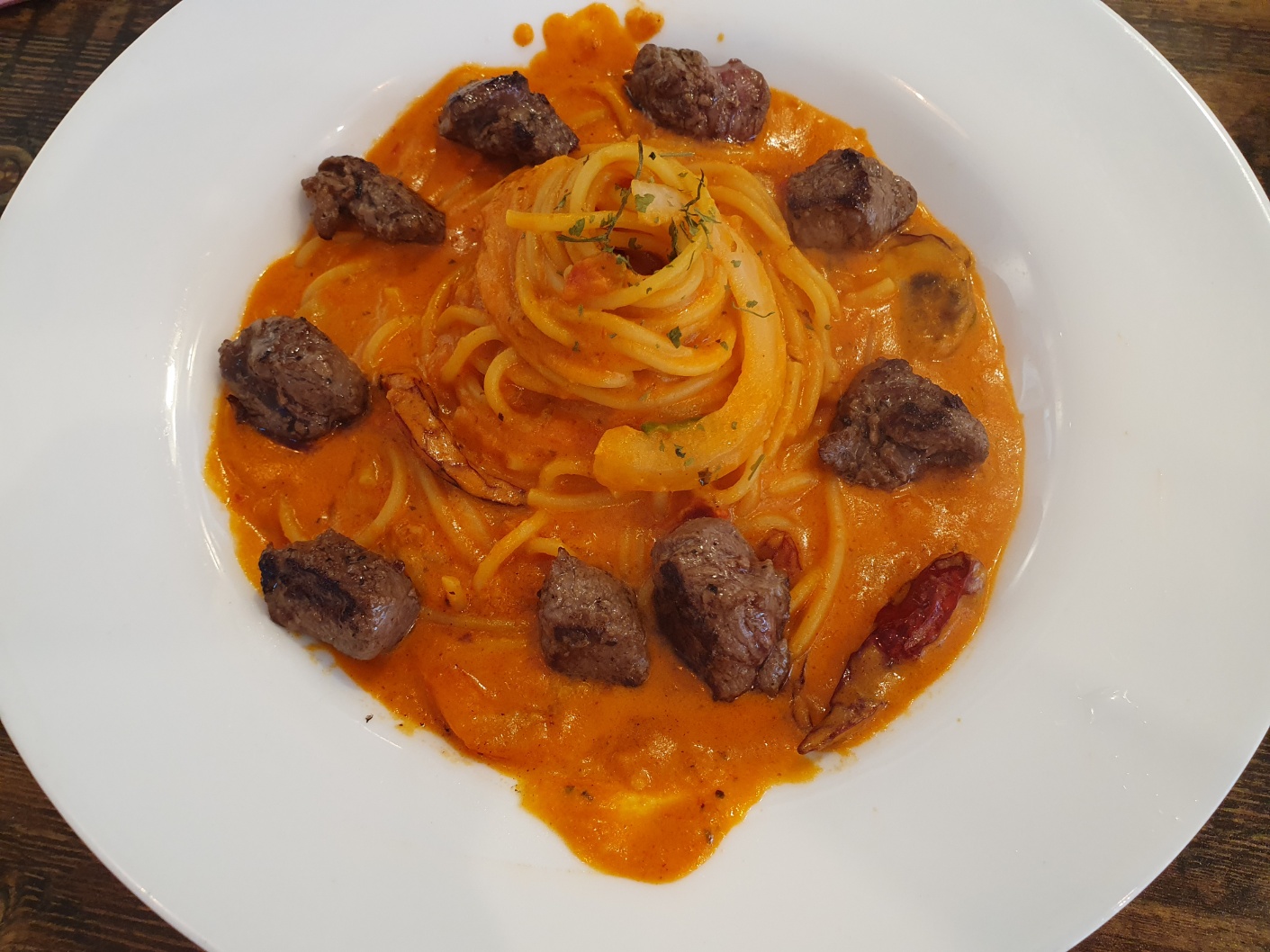 큐브스테이크 로제파스타 살짝 매콤하면서 스테이크는 부드럽고 스파게티와 잘 어울렸습니다.