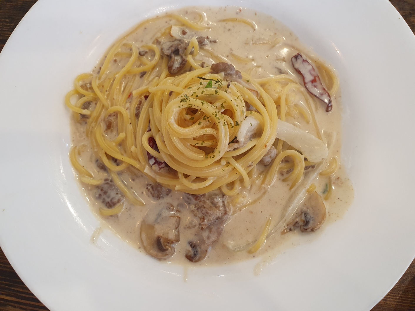 소스 듬뿍 불고기크림 스파게티입니다. 크림스파게티가 느끼하지 않고 살짝 매콤하니 불고기와 버섯이 잘 어우러져 깊은 맛이 나는 크림스파게티입니다. 아이 어른 다 좋아할 맛인 거 같습니다.