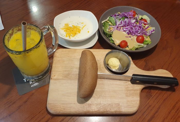 투움바파스타에 소스 많이... 짐붐바스테이크 사이드 메뉴에는 통고구마와 후렌치프라이, 크림수프 (수프는 가든 샐러드로 1,400원 추가하면 변경가능해서 수프하나와 샐러드하나 주문) , 오렌지 에이드는 덜 달게 주문했습니다.