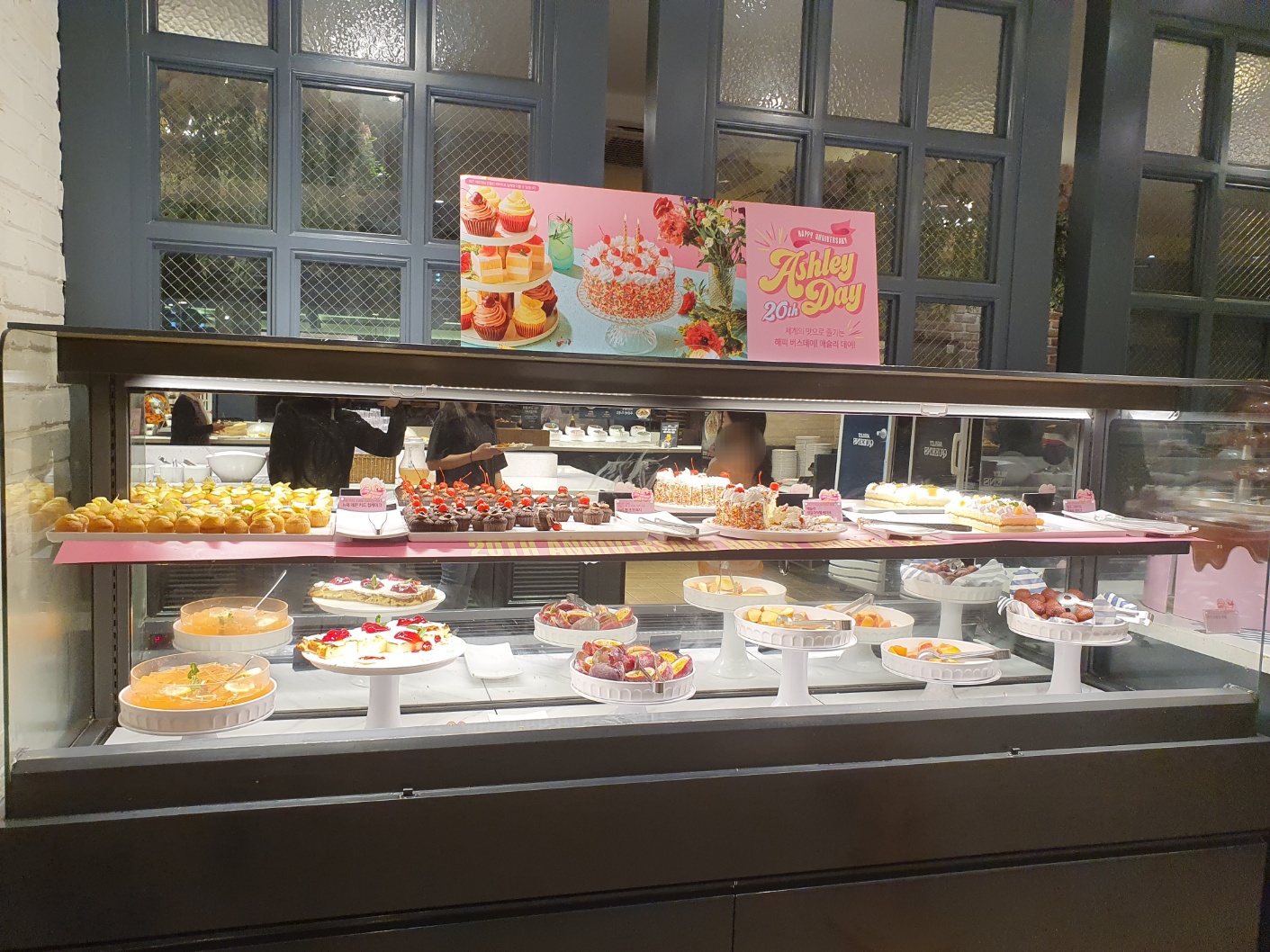 디저트로 먹음직스럽고 너무 예쁘네요. 뉴욕 레몬커드, 런던라즈베리 치즈 브라우니, 체리 앤 초코퍼지, 20주년 생일축하케이크, 젤리등 디저트 천국입니다. 20주년 한정 생일축하케이크는 정말 맛있었어요. 적당히 달콤함과 부드러운 빵의 조화가 따뜻한 아메리카노와 찰떡궁합이네요. 사진에는 없는 와플... 저는 항상 애슐리에서 마무리는 와플입니다. 배가 부른데도 더 먹을 수 있는 와플 때문에 오늘 2kg 찔 거 같아요.