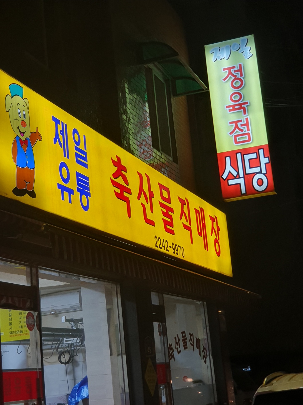 1층 정육점에서 고기를 사서 지하 식당으로 내려 갑니다.
