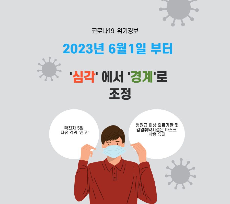2023년 6월 1일부터 코로나19 위기경보가 '심각'에서 '경계'로 조정한다고 합니다.