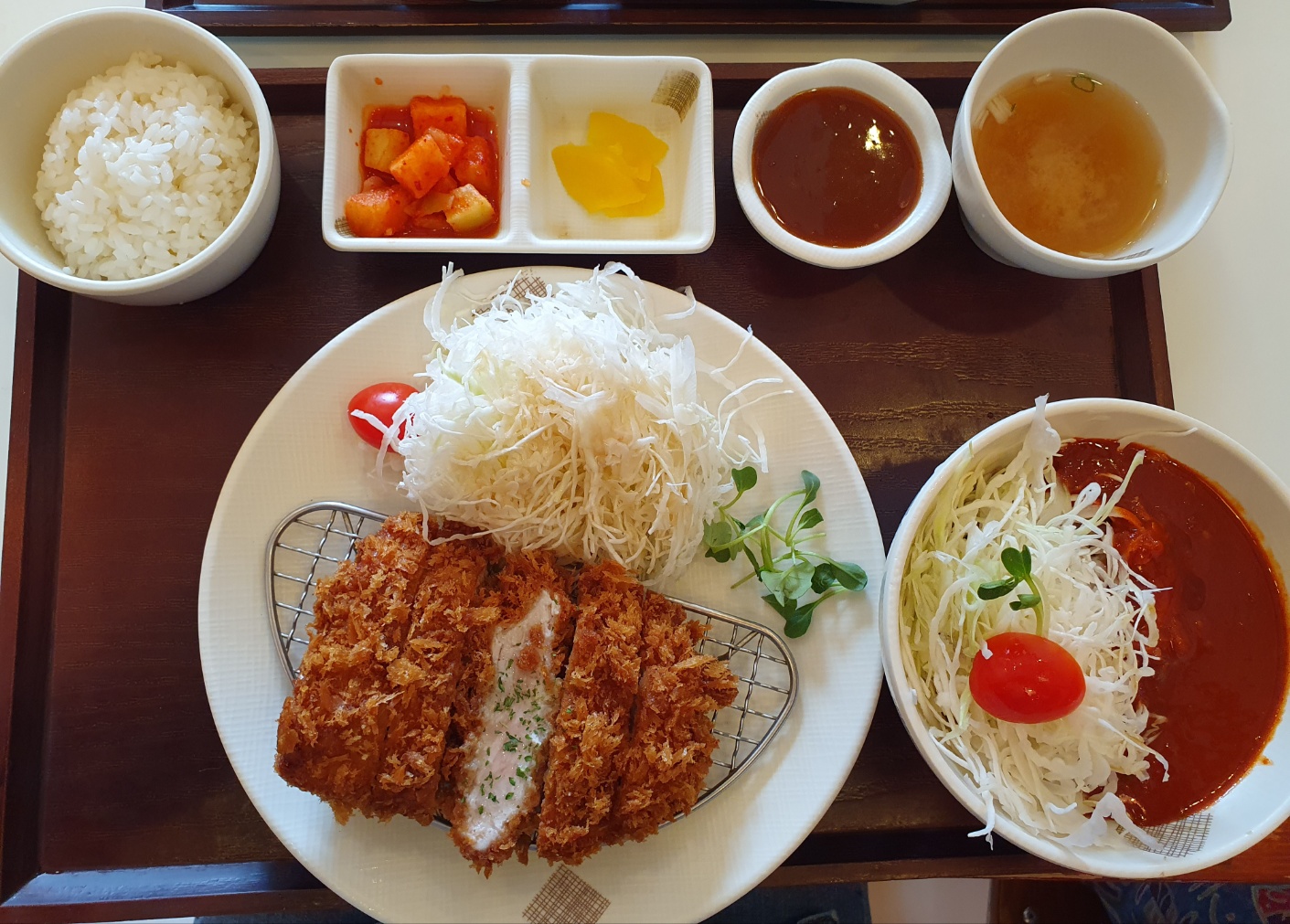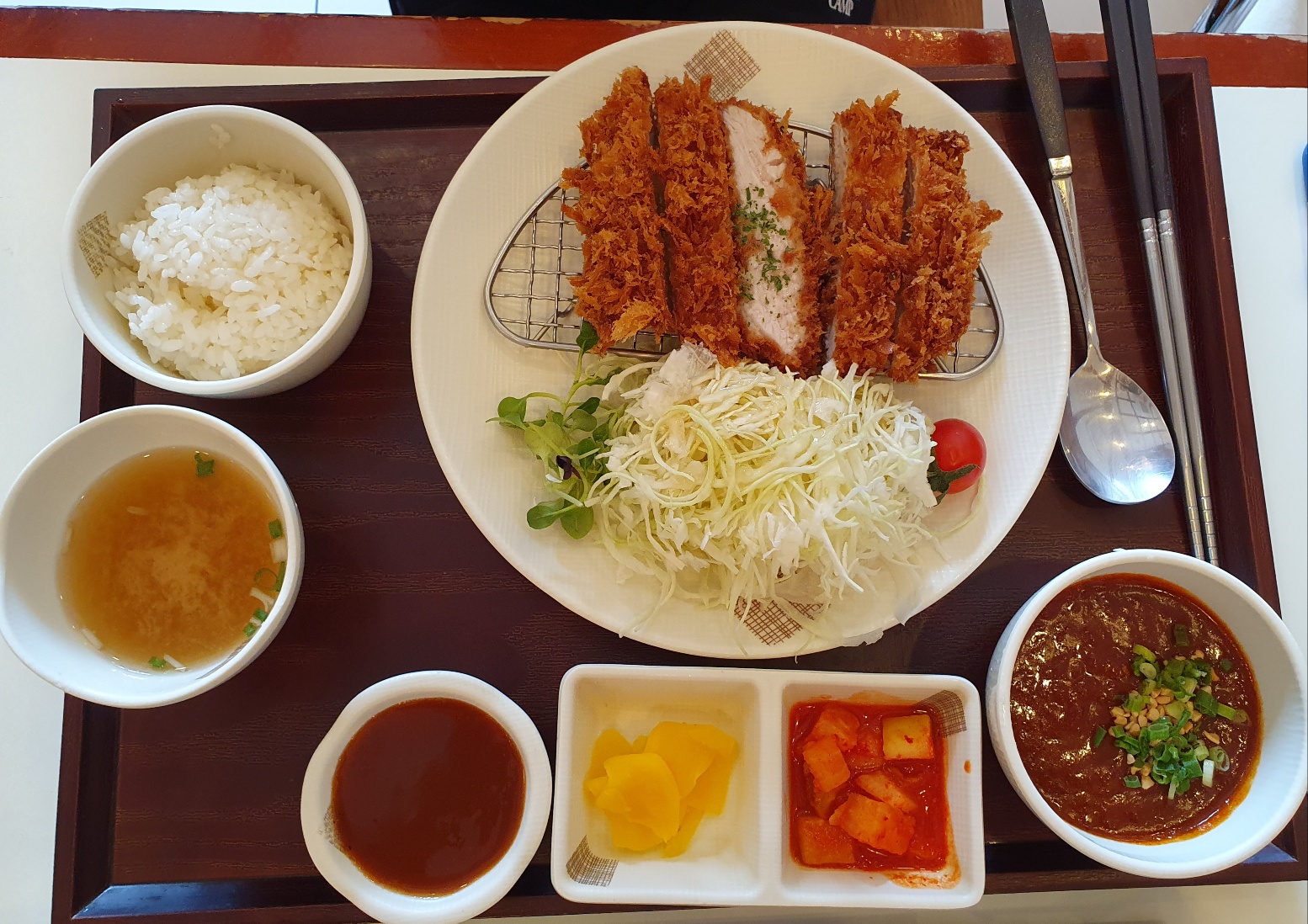매콤돈카츠 정식 입니다. 주문할 때 소스 따로에 체크하시면 이렇게 소스를 따로 주시고, 체크를 하지 않으면 소스가 돈카츠에 뿌려져서 나옵니다. 우리는 찍먹을 좋아서 소스 따로. 주문 전 직원분께 매콤의 단계를 물어보니 매운 라면보다는 맵고 불*라면보다는 덜 맵다고 하셨는데 매운 라면보다 훨씬 맵지 않았고 양념 치킨 맛에 흡사했습니다. 두툼한 돈카츠는 겉은 바삭하고 속은 아주 부드러워서 먹기에 아주 좋아았습니다. 갓 지은 밥이어서 그럴까요? 쌀 밥도 맛있더라고요.
