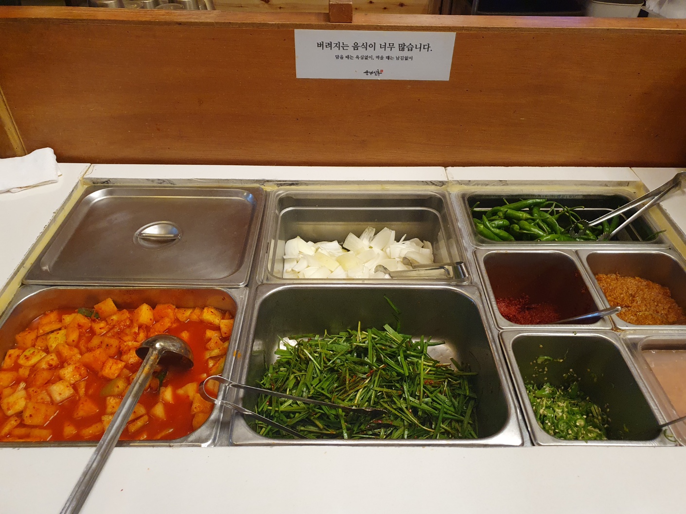 셀프바에는 김치, 야파, 부추무침, 청양고추, 쌈장, 양념장, 새우젓등 추가로 가져다 드실 수 있습니다.