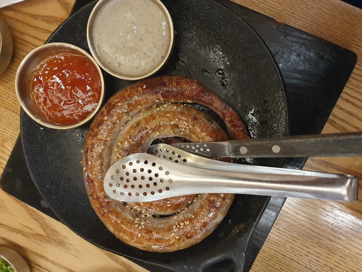 순대를 바삭하게 구워낸 세계 최초의 스테이크형 순대, 견과류와 흑미, 서리태, 녹두, 수수등을 섞어 건강한 순대라고 합니다. 칼로 썰어먹는 순대스테이크, 노릇노릇하게 잘 구워진 순대, 겉은 바삭바삭하고 속은 촉촉하니 견과류들이 씹히는 고소함까지 색다른 맛이었습니다. 달달한 칠리소스와 고소한 흑임자 소스를 찍어드셔서 좋습니다.