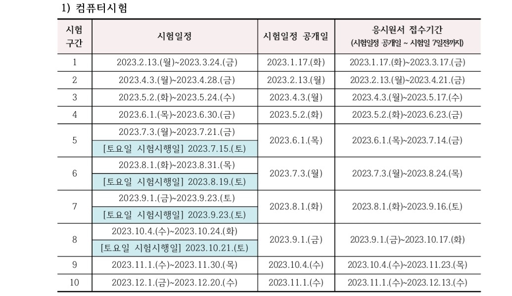컴퓨터시험 2.13~12.20까지 상설검정이며, 지필시험 일정은 3월~6월 , 7월~10월 각 월별로 1~2회로 진행됩니다.